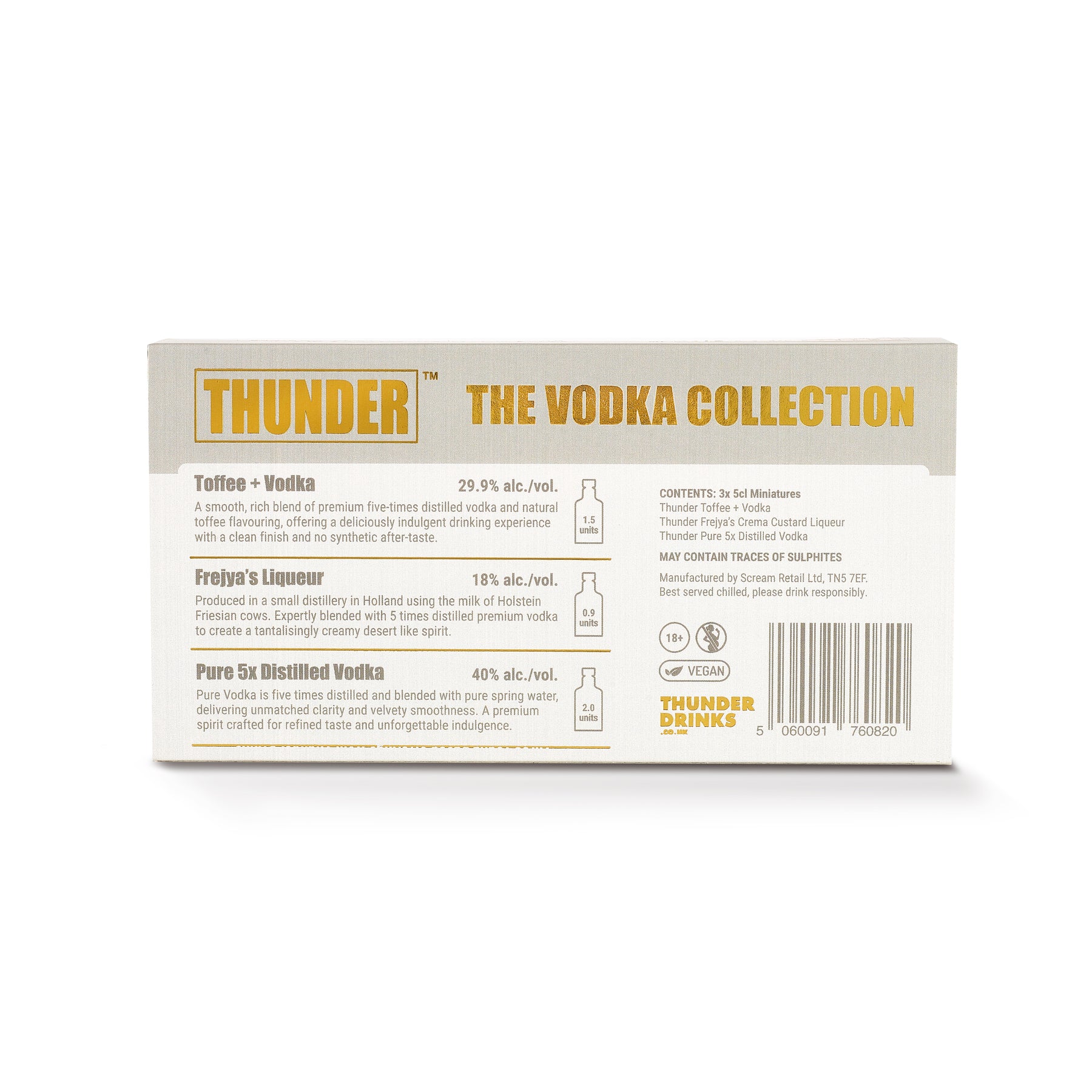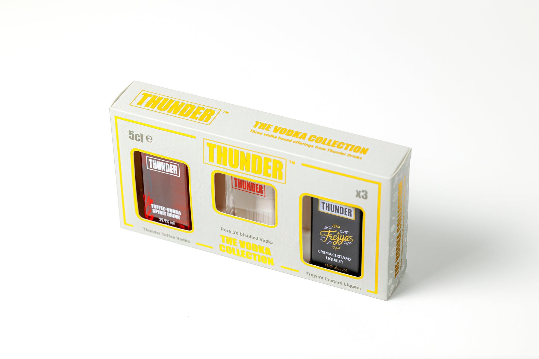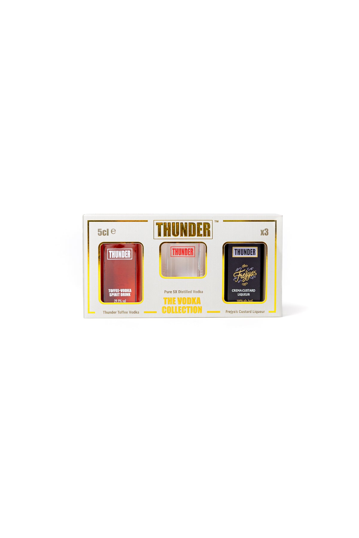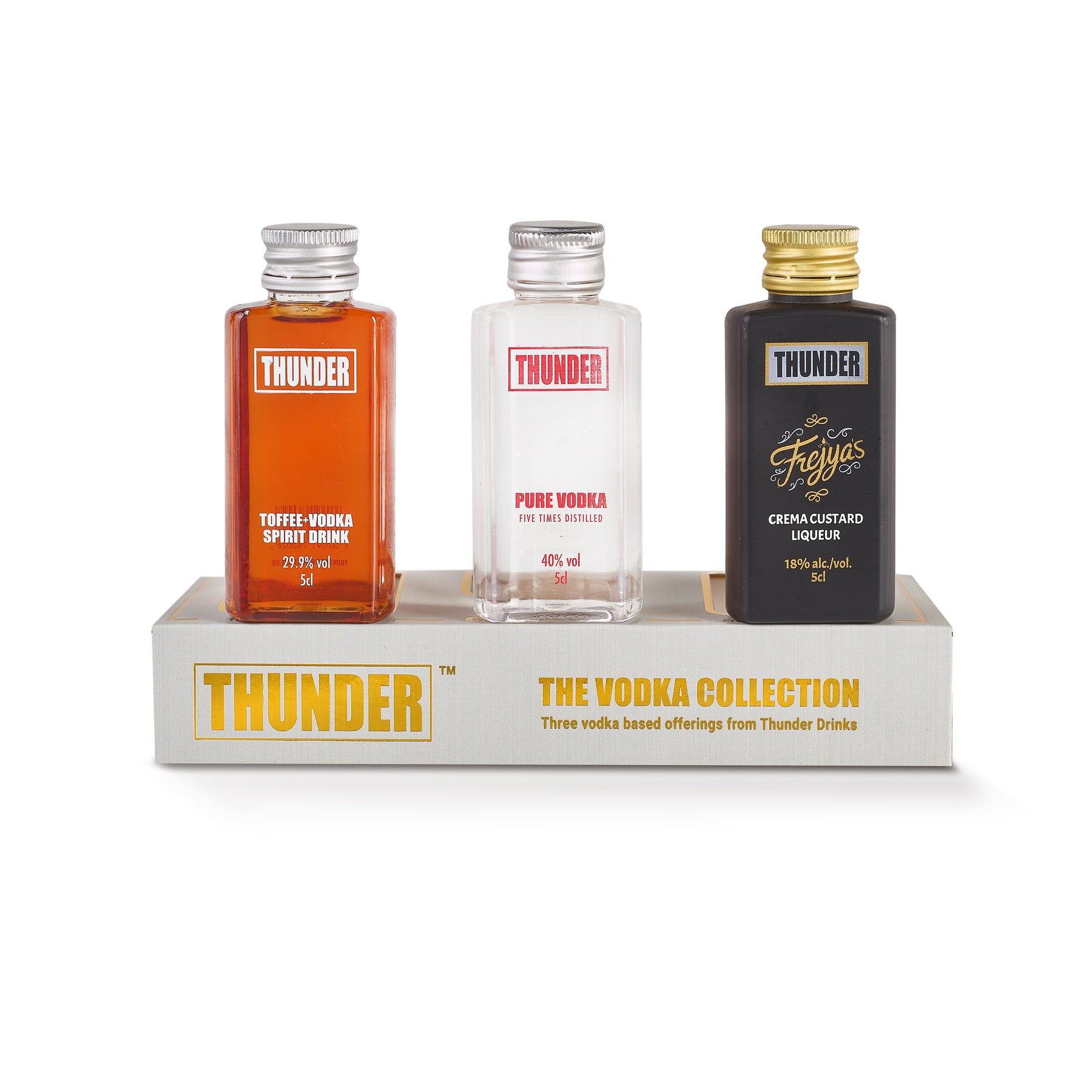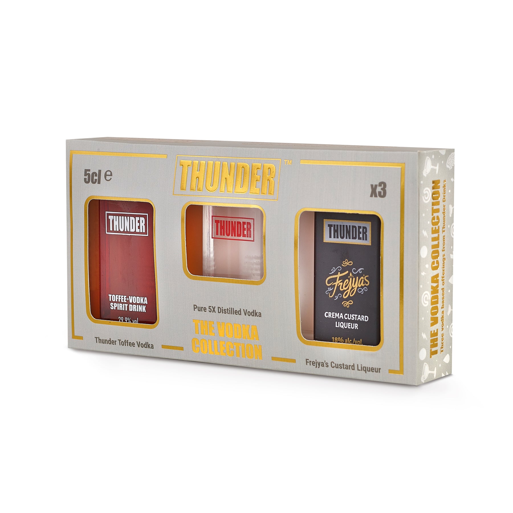 Inside, you’ll find Thunder Toffee Vodka (29.9% ABV) – rich, sweet, and warming with a luxurious toffee finish; Frejya’s Crema Custard Liqueur (18% ABV) – silky smooth and irresistibly creamy; and Thunder Premium Vodka (40% ABV) – a clean, five-times distilled vodka with exceptional clarity and balance.